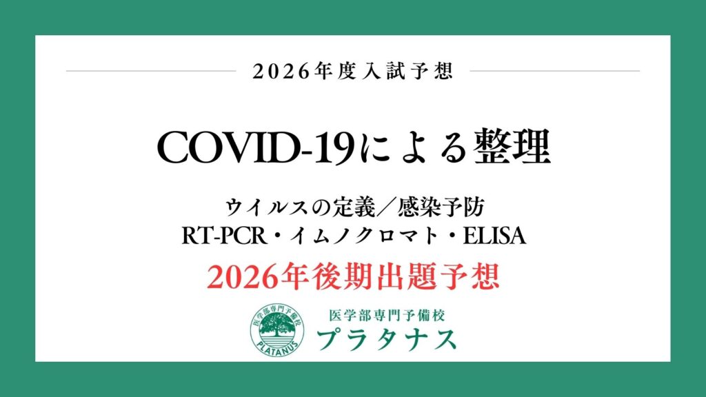 さらにCOVID-19は、遺伝子(RT-PCR)/抗原(イムノクロマト)/抗体(ELISA)という3系統の検査を同一テーマで比較させやすく、入試に非常に向く。 後期私立医学部は「知識確認」だけでなく、短い文章・図・表を読ませて原理理解と結果解釈を一気に問う形式が出やすい。COVID-19の検査は、