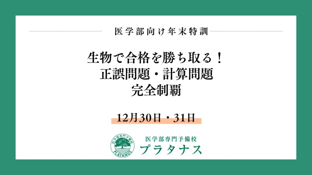 そこで、プラタナスでは、12月30日・31日の2日間にわたり、生物の正誤問題・計算問題を徹底的に仕上げる特訓講座を開催します!