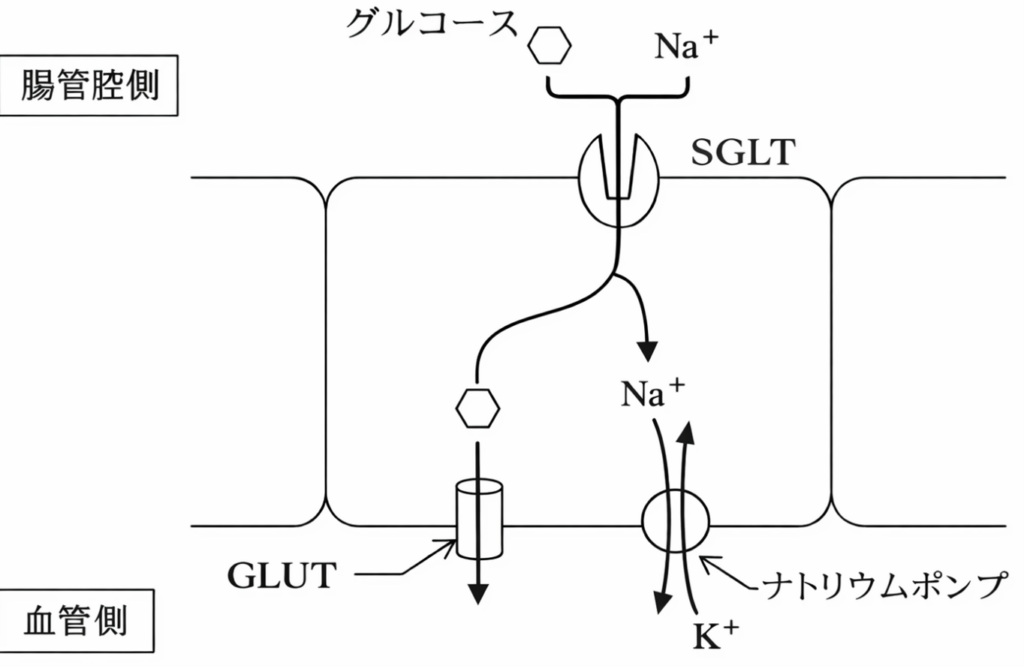 まず注目すべきは、腸管内(管腔側)に存在するSGLTです。SGLTは、Na⁺とグルコースを同時に細胞内へ取り込む共輸送体です。